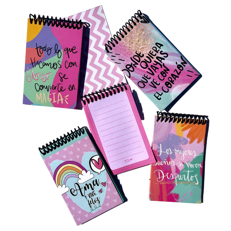 Anotador 8×13 tapa semirrígida 50 hojas rayadas impresas 1 color, anillo plastico. paq.x12 surtidas