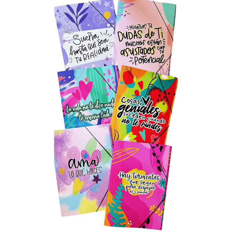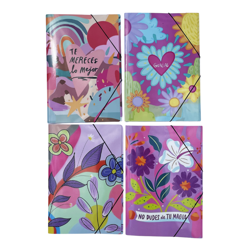 Carpetas 3 solapas oficio frases con elástico paq.x12 surtidas